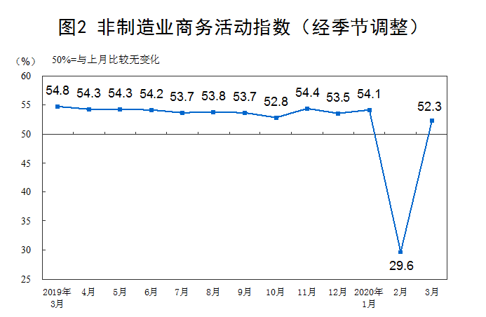 3月份,非制造業商務活動指數為52.3%,比上月回升22.7個百分點。