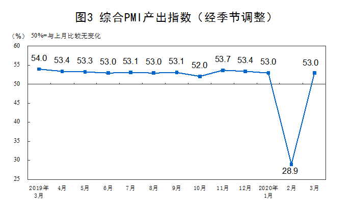 3月份,綜合PMI產出指數為53.0%,比上月回升24.1個百分點,表明我國企業生產經營活動總體恢復較快。
