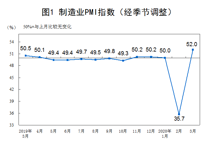 3月份,中國制造業采購經理指數(PMI)為52.0%,比上月回升16.3個百分點。
